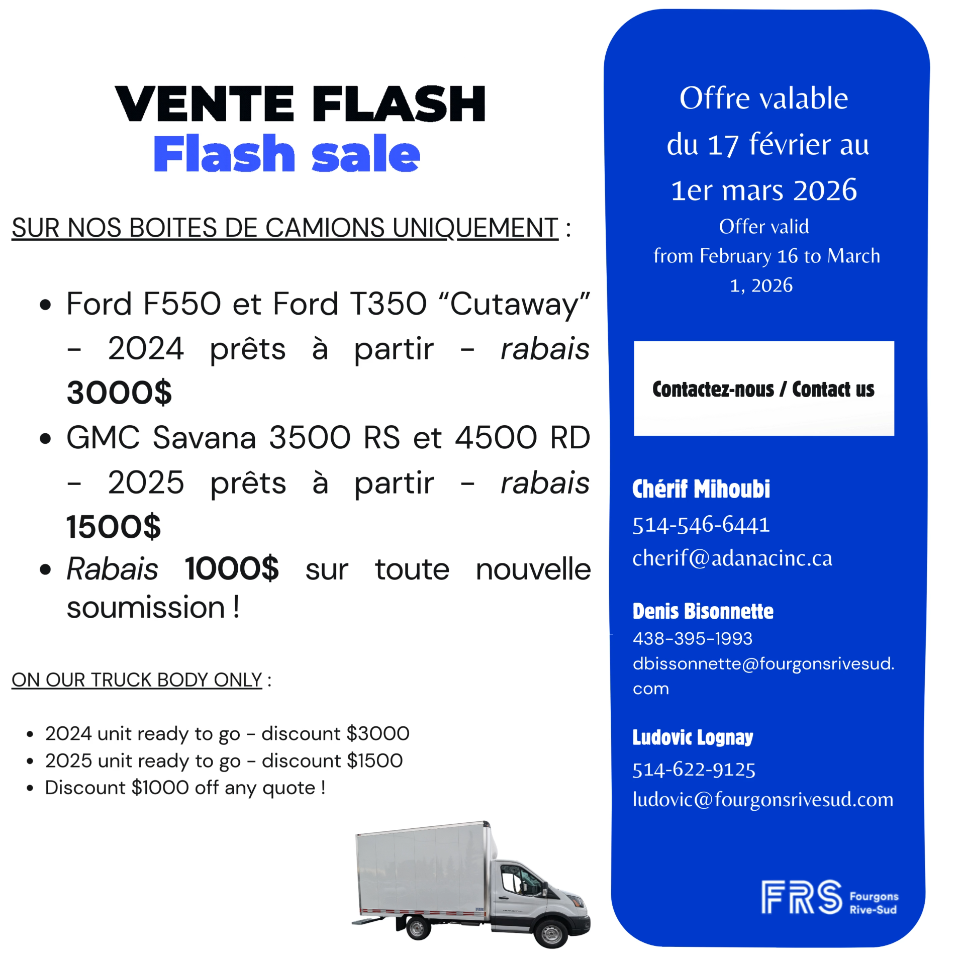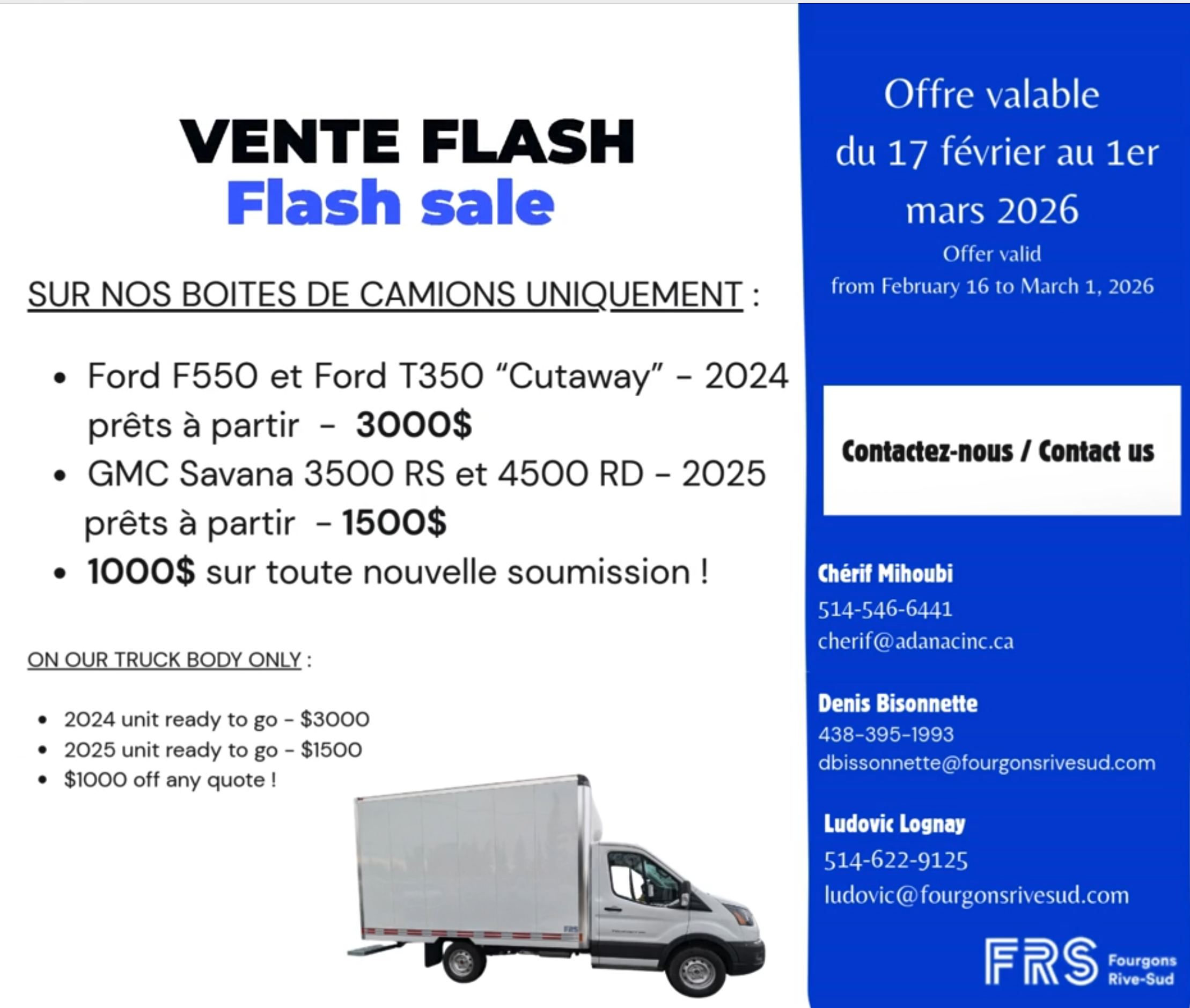 FRS est un fabricant de solutions de transport et d’unités mobiles parfaitement établi depuis plus de 30 ans. Notre notoriété et notre réputation de qualité nous ont valu la reconnaissance de Ford, GM et Chrysler comme constructeur autorisé. De plus, tous nos produits sont approuvés par Transports Canada, ce qui en confirme l’excellente qualité. Fiez-vous à notre expertise et à notre savoir-faire pour votre prochain achat.